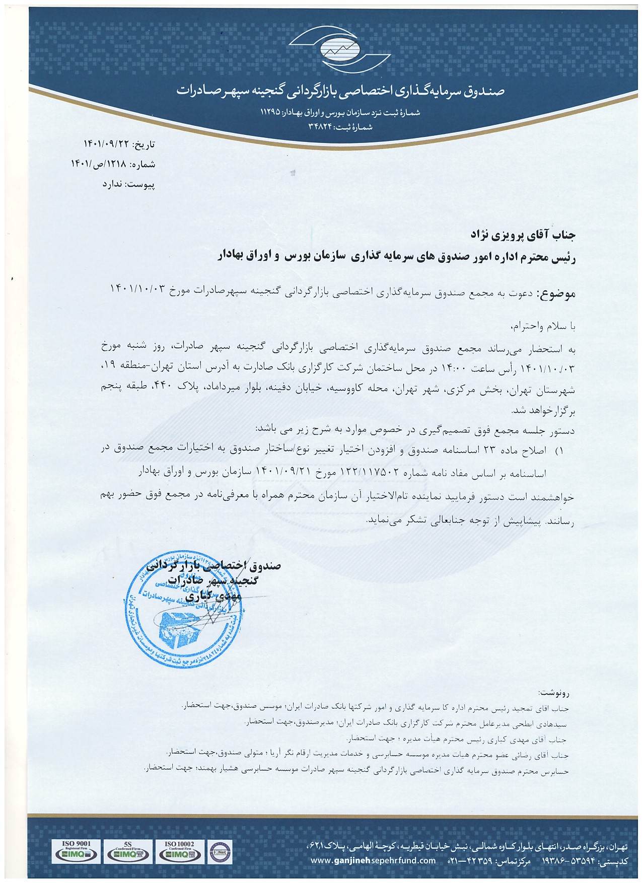 آگهي دعوت به مجمع صندوق سرمايه گذاري بازارگرداني گنجينه سپهر صادرات مورخ۱۴۰۴/۱۰/۱۰(افزودن نماد ثپهران و گشان)